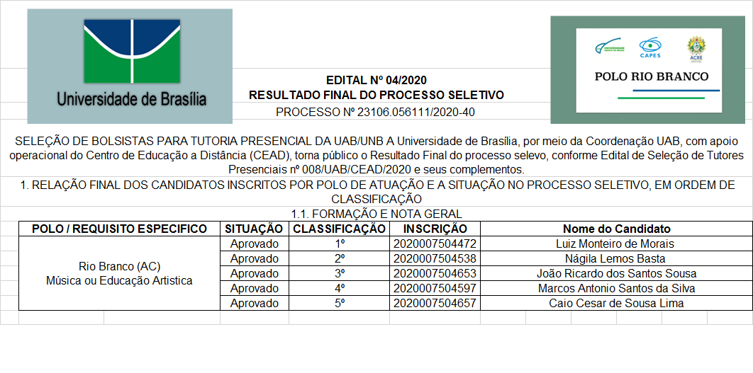 EDITAL Nº 009 - UAB/CEAD/2023 01 - ABERTURA PROCESSO Nº 23106.003783/2023-03 SELEÇÃO DE BOLSISTAS PARA TUTORIA A DISTÂNCIA DO CURSO DE LICENCIATURA EM MÚSICA A Universidade de Brasília (UnB), por meio da Coordenação do Curso de Licenciatura em Música da Universidade Aberta do Brasil (UAB), com apoio operacional do Centro de Educação a Distância (CEAD) e da Coordenação UAB, comunica aos interessados abertura de processo seletivo de bolsistas para constituir equipe de tutores a distância da UAB/UnB e formação de cadastro reserva. 1. DISPOSIÇÕES PRELIMINARES 1.1. O presente Edital rege o processo de seleção temporária e de cadastro reserva de bolsistas para constituir equipe de tutores da UAB/UnB, para atuação em tutoria de disciplinas a distância, em observância ao disposto na Portaria Capes nº 102, de 10 de maio de 2019. 1.2. Entende-se por tutor da instituição, na modalidade EaD, todo profissional de nível superior, a ela vinculado, que atue na área de conhecimento de sua formação, como suporte às atividades dos docentes e mediação pedagógica, junto a estudantes, na modalidade de EaD, nos termos do Art. 8, parágrafo 2º, da Resolução do Conselho Nacional de Educação n° 001, de 11 de março de 2016. 1.3. A atuação como bolsista tutor nas vagas previstas neste Edital não originará qualquer vínculo empregatício com a UnB, sendo sua atribuição e contrapartida definidas pela Portaria Capes nº 183, de 21 de outubro de 2016. 1.4. O candidato que, por qualquer motivo, deixar de atender às normas e às recomendações estabelecidas será automaticamente eliminado do processo de seleção/classificação, sendo convocado o candidato subsequente. 1.5. Os candidatos classificados em posições excedentes poderão ser contemplados, respeitada a ordem de classificação para a vaga/área, caso haja desistência, seja constatada inaptidão do candidato selecionado ou em razão do surgimento de outras vagas para o mesmo fim, no período de vigência deste Edital. 2. ATRIBUIÇÕES DO BOLSISTA DA EQUIPE DE TUTORES 2.1. Os bolsistas selecionados deverão desenvolver, respeitadas as determinações legais, as seguintes atribuições: a) Cumprir todas as atribuições e determinações previstas no Termo de Compromisso (Anexo IV). b) Acessar diariamente a disciplina no ambiente Moodle. c) Mediar a comunicação de conteúdos entre o professor e os alunos. d) Acompanhar as atividades, conforme o cronograma do curso. e) Apoiar o professor da disciplina no desenvolvimento das atividades do curso. f) Acompanhar o desenvolvimento teórico-metodológico do curso. g) Atender e orientar os alunos nas questões teórico-metodológicas do curso. h) Assegurar a qualidade do atendimento aos alunos, observando as suas necessidades referentes ao curso. i) Acompanhar o trabalho dos alunos, orientando, dirimindo dúvidas e favorecendo o diálogo. j) Acompanhar a avaliação dos trabalhos acadêmicos, quando solicitado, em no máximo 7 (sete) dias, além dos trabalhos de recuperação paralela e final dos alunos. k) Interagir com outros tutores, auxiliando-os em suas dúvidas e definindo estratégias pedagógicas.